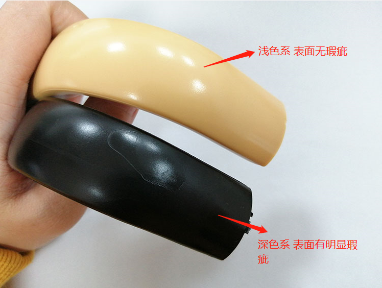 這是客戶的一個小電器外觀產(chǎn)品,材料為PP料,產(chǎn)品內(nèi)部實心,膠位厚。通過圖片可以看到,客戶寄來的這兩個樣板(同一個機臺生產(chǎn)),淺色的把手表面無明顯瑕疵,不會影響美觀;深色的把手表面有明顯的流痕瑕疵,嚴重影響了美感,看起來像是瑕疵品。