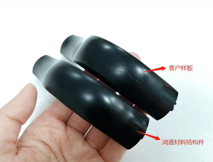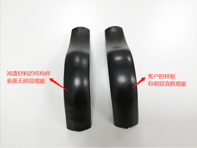 可以看到,對比起客戶寄來的深色樣板,鴻盛的材料在同樣的機臺同樣的深色下注塑出來的結(jié)構(gòu)件表面無明顯流痕,不影響美觀,顏色也很均勻。