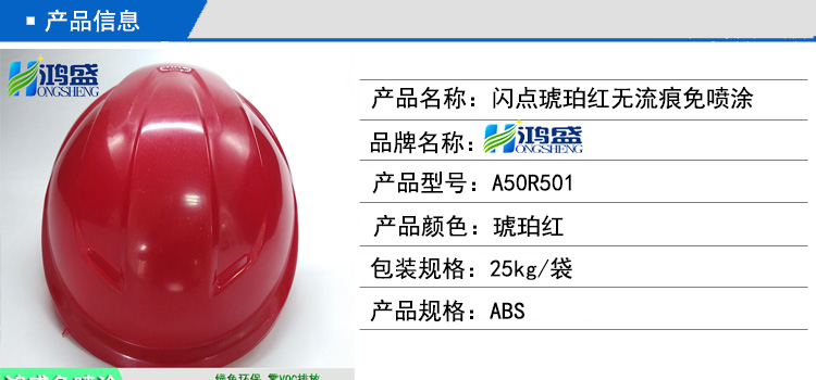 閃點琥珀紅無流痕免噴涂合金材料在安全帽上的廣泛應用。這款產品采用編號A50R501原料生產制作,能夠達到高光閃爍無流痕的效果。色澤潤亮,效果超出了客戶的預期,深受客戶的喜愛。客戶看到我們的之前生產的一款安全帽樣板后評價道材料非常亮、非常靚、非常炫、非常閃,能夠達到18%~30%的抗沖擊性而且是高光效果。