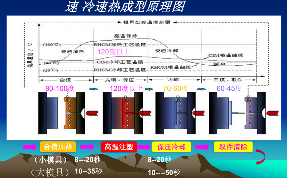 該技術(shù)采用電加熱的方式,在短時(shí)間內(nèi)把模具的表面溫度加熱到很高,然后在幾十秒之內(nèi)又能把溫度下降到50℃以下,從而幫助高光注塑成型順利完成。