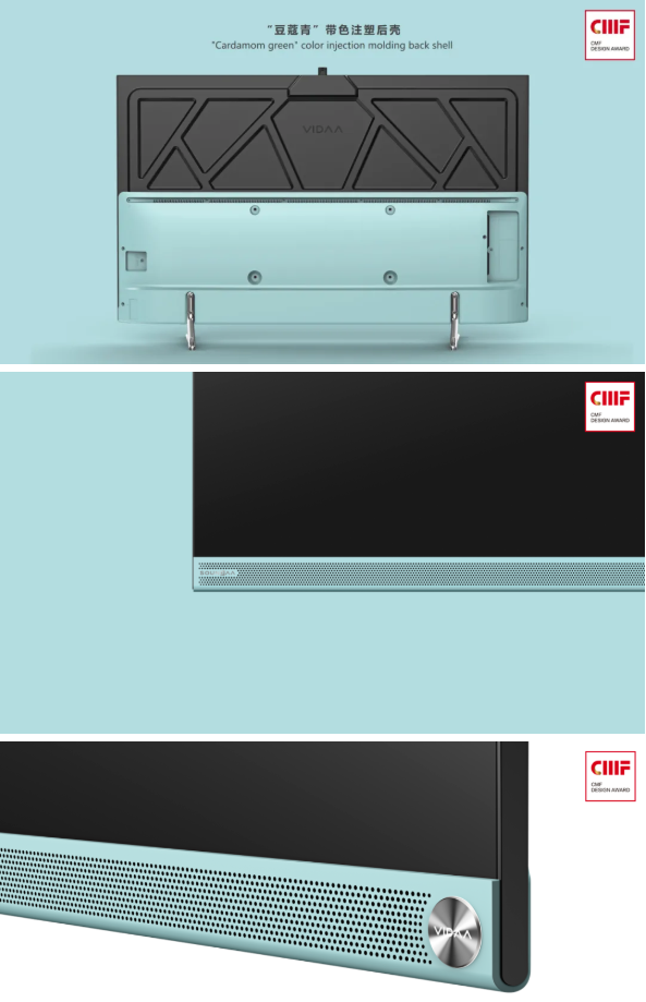 海信V3F系列電視榮獲2020國際CMF設(shè)計獎,竟是用了免噴涂材料?在本次國際CMF設(shè)計獎評選中,海信V3F系列電視將“豆蔻青”色彩在黑電中的“大面積”“大膽”應(yīng)用,亮點在于用環(huán)保免噴涂材料做成的帶色注塑前出音網(wǎng)罩,質(zhì)感和時尚感十足。