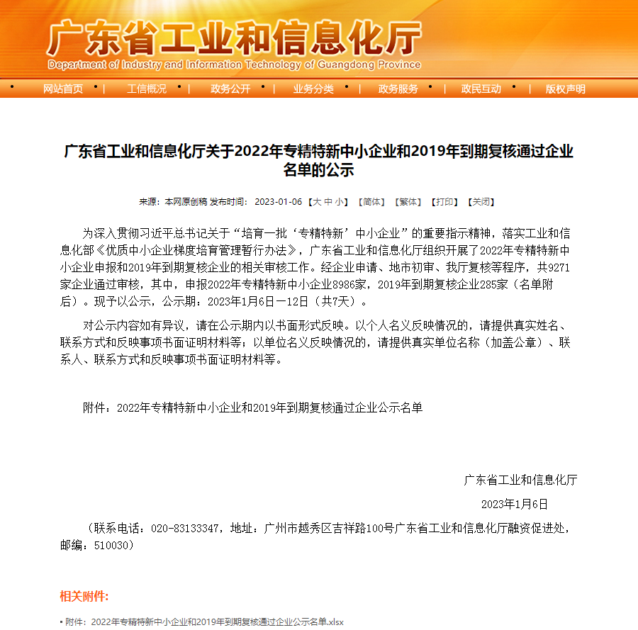 1月6日,鴻盛新材被廣東省工業和信息化廳評為“廣東省專精特新中小企業”,充分體現廣東省工業和信息化廳對鴻盛新材在創新能力、技術研發實力及行業專業化程度等方面的高度認可。